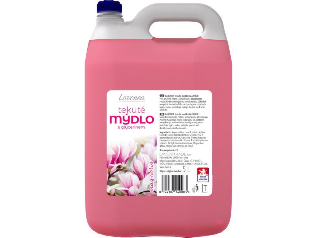 Lavon tekuté mýdlo Magnólie 5 l je kvalitní kosmetický prostředek určený pro každodenní hygienu rukou. Díky jemnému složení účinně odstraňuje nečistoty a zároveň chrání pokožku před vysušováním. Krásná květinová vůně magnólie dodá pocit svěžesti a čistoty po každém použití.