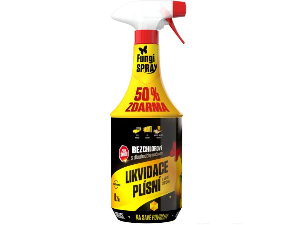 Stachema Fungispray citrón bezchlorový dezinfekční přípravek, 500 ml je vysoce účinný prostředek určený k likvidaci plísní, bakterií a kvasinek v domácnostech i komerčních prostorách. Díky bezchlorovému složení je šetrnější k povrchům i ovzduší a nezanechává nepříjemný chlorový zápach.